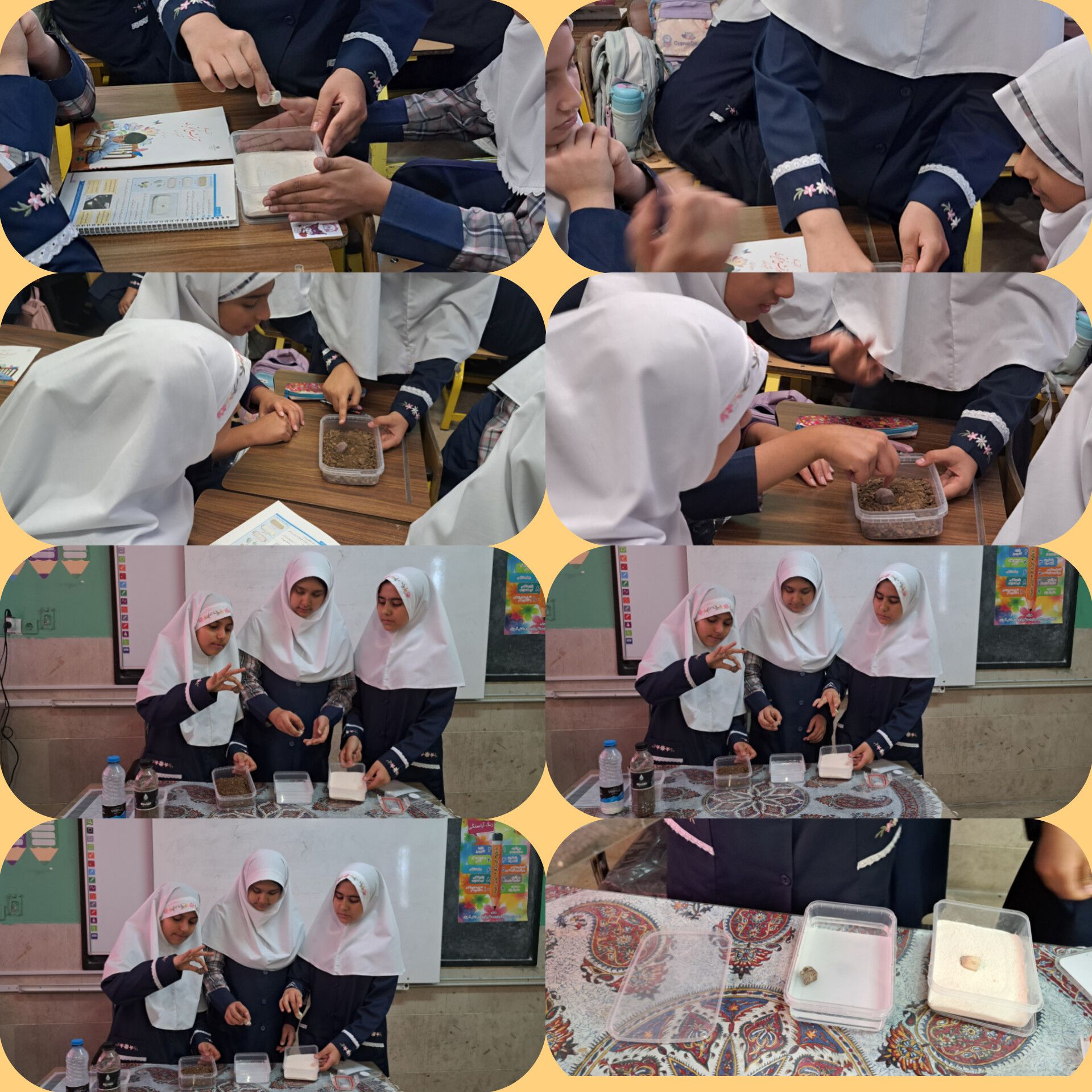 دانشمندان اینده در کلاس ششم در هفته چهارم مهرماه به آزمایش و مشاهده پرداختند موضوع:آزمایش بررسی برخورد شهاب سنگ ها و تاثیر آنها بر عمق و قطر گودال های در مکان های مختلف
